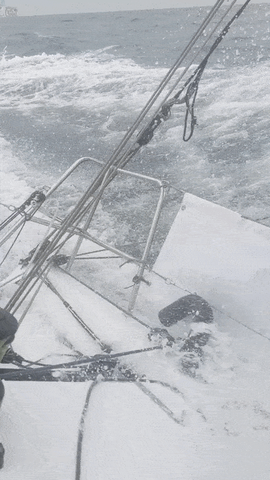 Environ 20 milles avant Tuskar, dans 25-30 noeuds de vent, lors d'un changement de quart, je prends la relève de Rémi. Alors que j'en suis toujours à prendre mes repères, je n'arrive pas à repousser la barre pour relancer le bateau en fin de surf. Le stick se replie et le bateau empanne ! Les voiles se gonflent contre le gréement, et le bateau se couche à 90°, avec tous les ballasts remplis du mauvais côté qui l'empêchent de se redresser. C'est ce qu'on appelle un vrac en bonne et dûe forme !