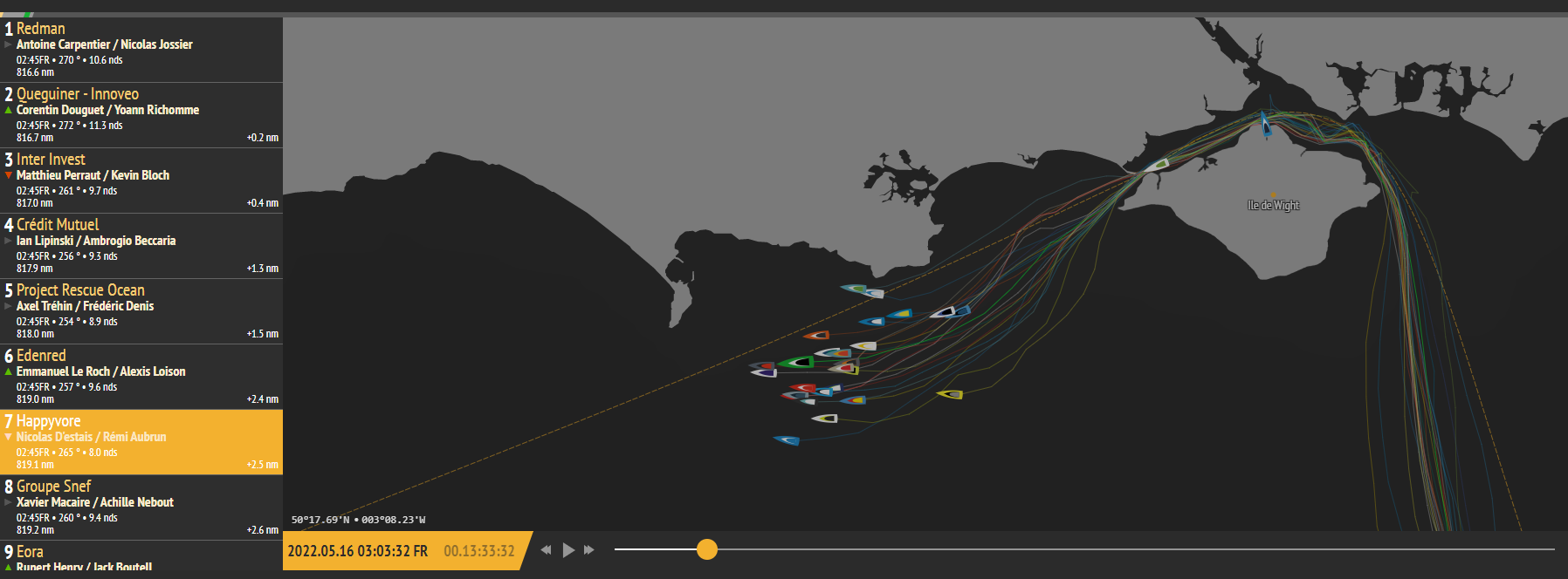 Le bateau va vite mais n'a pas spécialement été dessiné pour ces conditions. Face à nos concurrents nous perdons logiquement un peu de terrain mais nous revenons fort sur la tete de course à la tombée de la nuit vers l'ile de Wight. Nous passons la nuit à régater au contact de nos concurrents, dans les petis airs, à jouer avec les courants et contre-courants des eaux troubles du Solent. Une lutte honorable, puisqu'à la sortie du Solent nous sommes aux avant-postes en 7e position. Et vu la qualité du plateau je peux vous dire qu'on est contents d'être là avec Rémi !