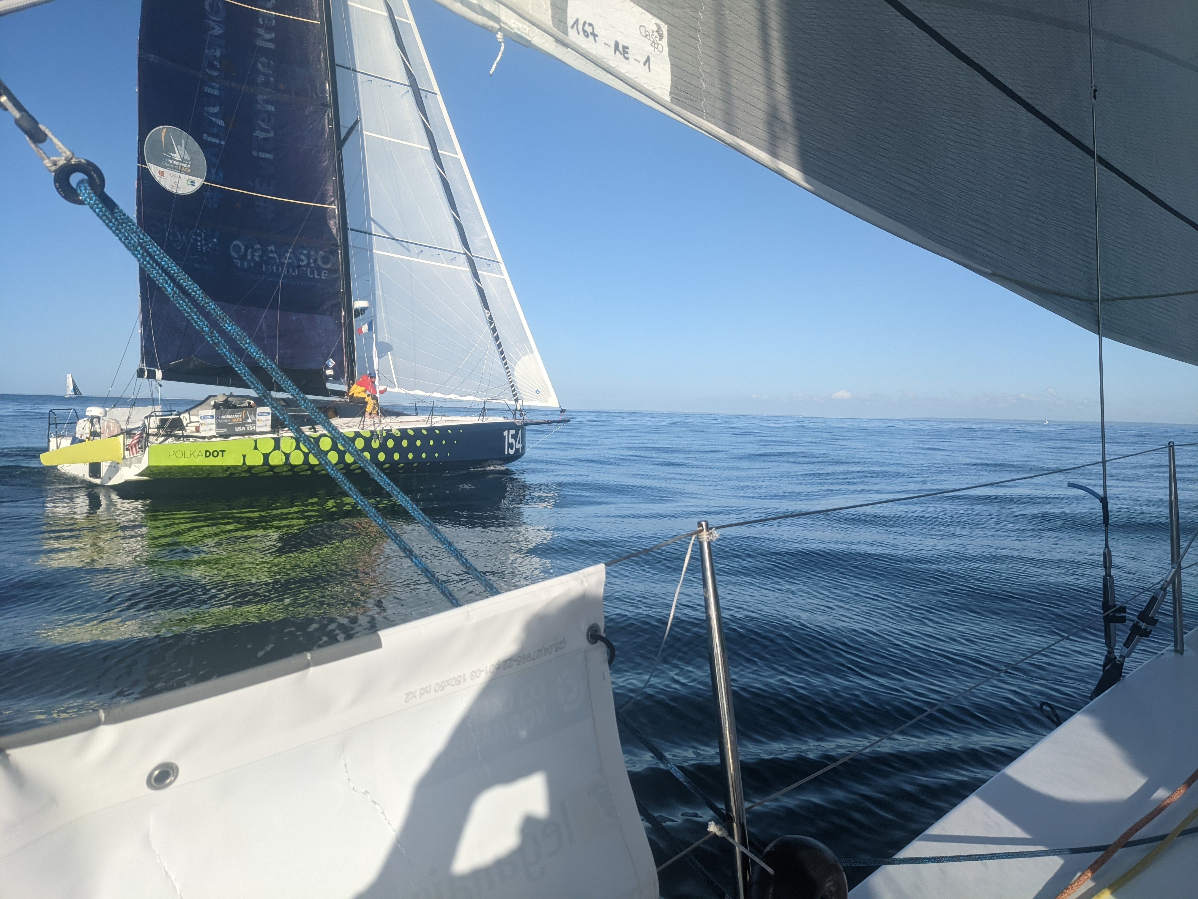 En hissant la grand-voile à la sortie du port le taquet qui sert à bloquer la drisse lâche et nous ne pouvons bloquer la grand voile en position haute. Nous passons plusieurs dizaines de minutes à réparer et arrivons en retard sur la zone de départ de course. Tout juste à temps pour repérer la position des bouées de départ et du parcours en baie. Mais nous faisons un parcours honorable (7e à la première marque de parcours) si bien que lorsque nous mettons le cap vers l'Angleterre nous sommes bien au chaud dans le peloton avec nos concurrents !