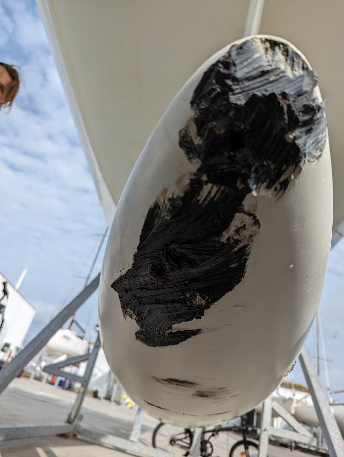 Les uniques réparations à mener concernent donc le plomb du bulbe de la quille. C’est moche, mais c’est pas le genre de choses qui font peur à Léo. Il s’est attelé dès mercredi pour remettre cela en état. Le bateau sera remis à l’eau demain, à temps pour le dernier stage d’entraînement avec nos camarades lorientais.