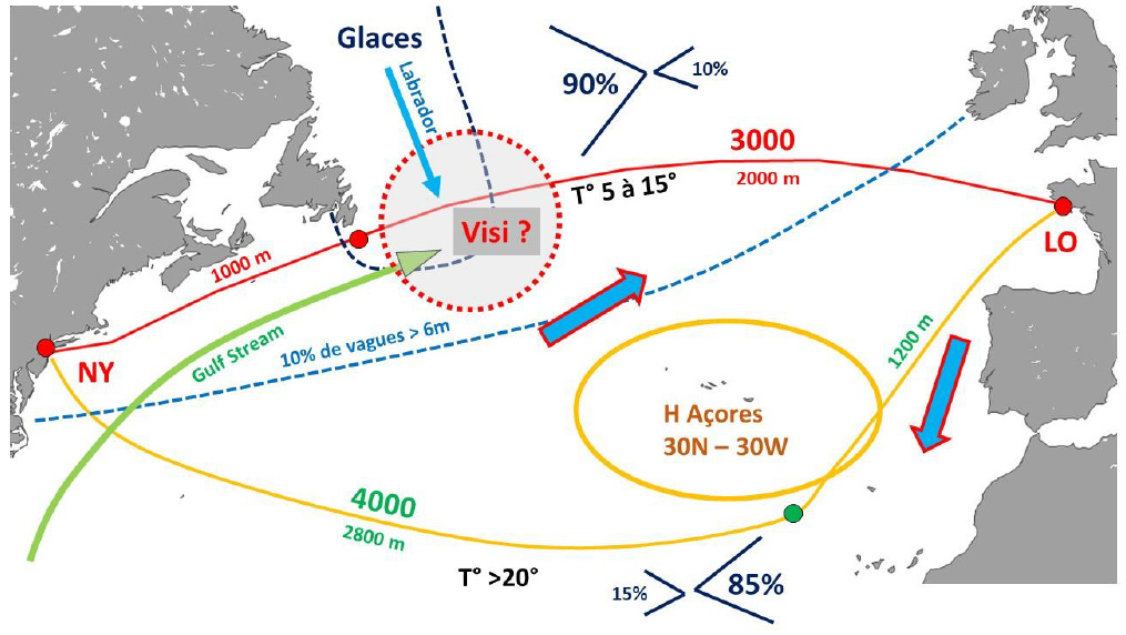 - Nous serons contre le vent : à l’inverse de toutes les autres courses transatlantiques, The Transat se fait statistiquement à 90% contre le vent. Au lieu de faire route par le sud de l’Anticyclone des Açores poussés par le vent, nous serons probablement obligés, pour rejoindre New-York, de naviguer dans le Nord de l’Anticyclone et donc contre les vents dominants !