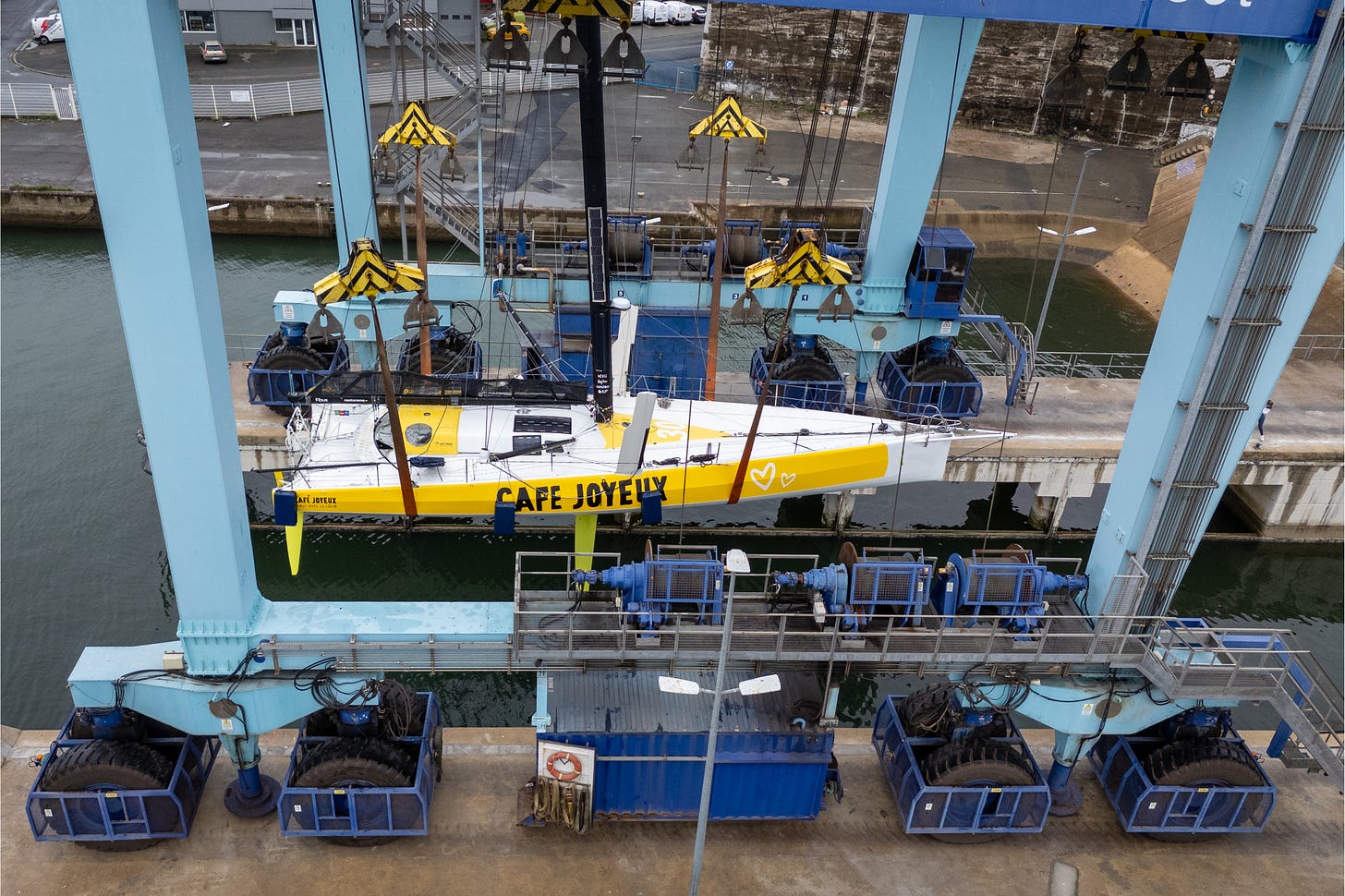 Après de nombreux travaux principalement cosmétiques (décoration de la coque, peinture de presque 1000m2 de voiles), l’équipe a remis à l’eau notre bateau Joyeux sous ses nouvelles couleurs.